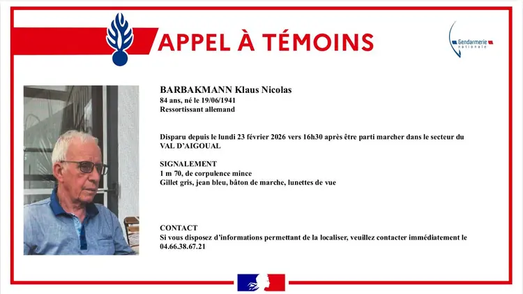 La gendarmerie du Gard lance un appel à témoins après la disparition d'un homme âgé de 84 ans. Nicolas Klaus Barbakmann, ressortissant allemand de 84 ans, est porté disparu depuis le 23 février 2026 après être parti marché dans le secteur du Val d’Aigoual.L’homme est de corpulence mince et mesure 1m