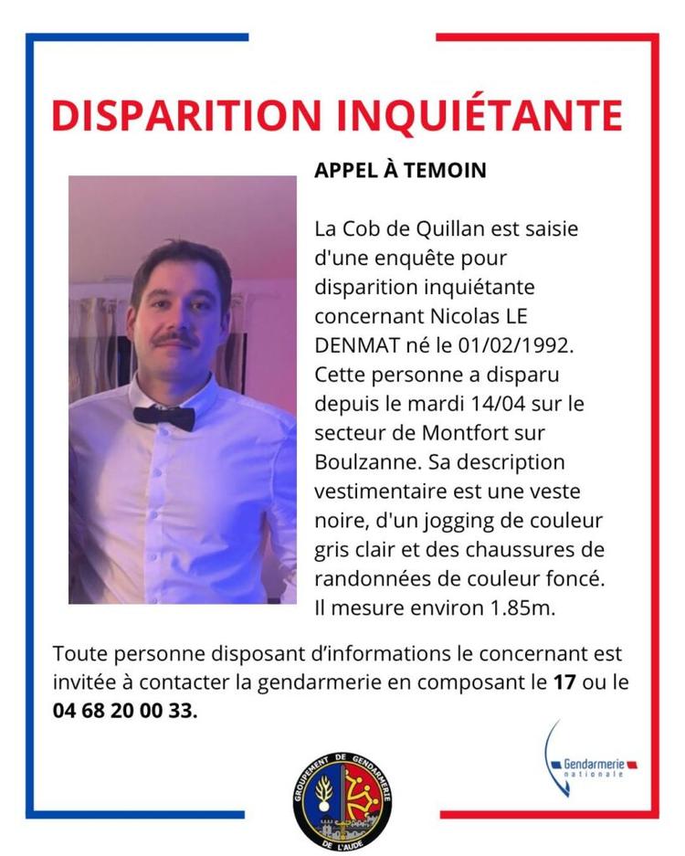 Nicolas Le Denmat, né le 1er février 1992, est introuvable depuis le mardi 14 avril 2026. Il a disparu sur le secteur de Monfort-sur-Boulzanne (Aude). La communauté de brigades de Quillan, saisie de cette disparition inquiétante, lance un appel à témoins. Nicolas Le Denmat, âgé de 34 ans, mesure 1,85 m et est vêtu d’une veste noire, d’un jogging de couleur gris clair et de chaussures de randonnée de couleur foncé. Toute personne disposant d’informations le concernant est invitée à contacter la gendarmerie en composant le 17 ou le 04.68.20.00.33.