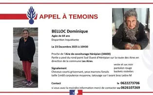 Dominique Belloc a disparu depuis le 23 décembre à Hérépian. Un appel à témoins a été lancé. Dominique Belloc, âgée de 64 ans, est introuvable depuis ce mardi 23 décembre aux alentours de 10h30. D’après Midi Libre, Dominique Belloc revenait d’un week-end à Lamalou-les-Bains avec son mari. Sur le che